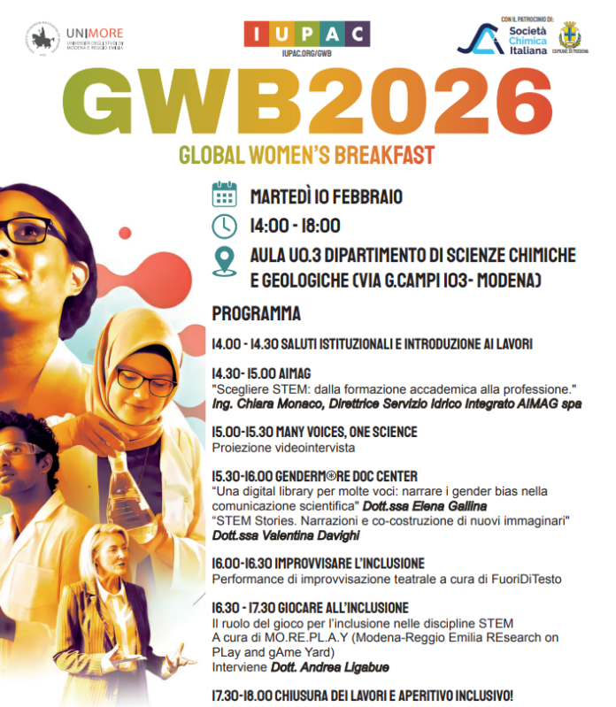 Il Global Women’s Breakfast – GWB, iniziativa internazionale promossa da IUPAC in occasione della Giornata Internazionale delle Donne e delle Ragazze nella Scienza delle Nazioni Unite, torna nel 2026 con l’edizione “Many Voices, One Science” al Dipartimento di Scienze Chimiche e Geologiche di Unimore (https://iupac.org/gwb/2026/gwb2026unimore/).