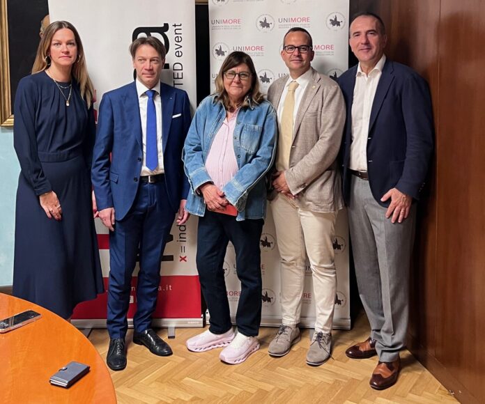 Nella foto da sx: Sara Paolini, direttrice del Cineporto dell’Emilia Romagna; Fabrizio Bulgarelli, curatore di TEDxModena; Edith Barbieri, direttrice della Fondazione San Carlo; Prof. Francesco Leali, Unimore e Muner; Massimiliano Delsante, Co-ceo della startup Robomagister.
