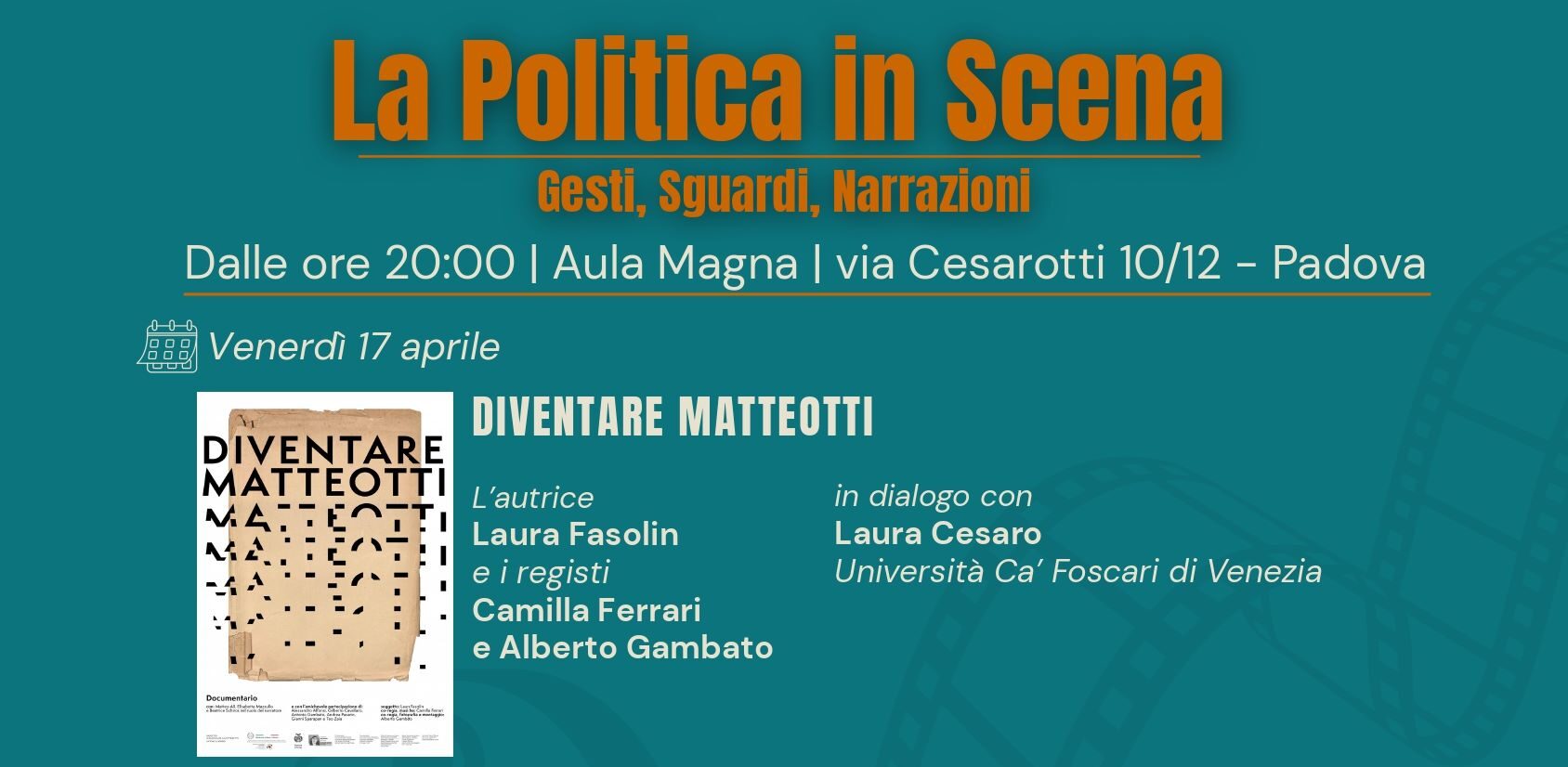 Il film ripercorre la figura di Giacomo Matteotti come processo di costruzione politica e civile, interrogandone la ricezione e l’attualità. Intervengono l’autrice Laura Fasolin e i registi Camilla Ferrari e Alberto Gambato, in dialogo con Laura Cesaro (Università Ca’ Foscari Venezia).