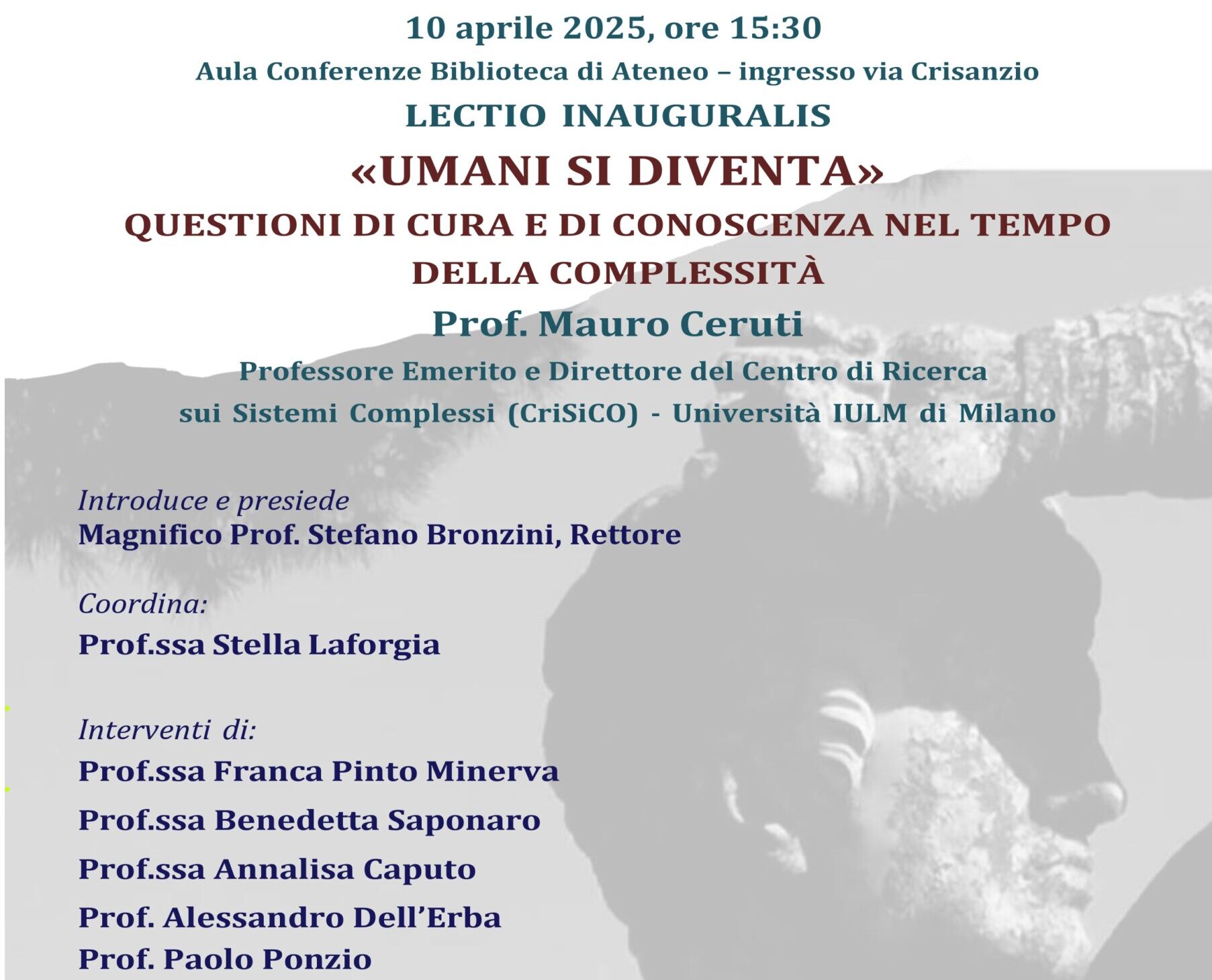 Negli ultimi anni UniBa ha investito moltissimo nella formazione al pensiero capace di relazioni e non di dissipazioni e, in questa tradizione che appartiene alla sua identità scientifica e sociale, si inserisce la lectio del filosofo della complessità, tra i più importanti nel mondo insieme ad Edgar Morin, che negli ultimi 50 anni si è occupato, insieme ai più illustri studiosi, di scienze esatte ed umane, di studiare il proprium evolutivo nella posizione anti-ferocia che connette i sistemi viventi: *vita tua, vita mea*.