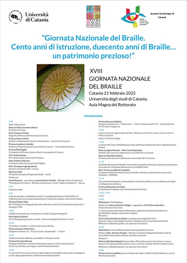 Venerdì 21 febbraio alle 9, nell’aula magna del Palazzo Centrale dell’Università di Catania, si celebrata la Giornata Nazionale del Braille. Diverse le iniziative messe in campo in tutta Italia e tante anche quelle organizzate dalla sezione di Catania dell’Unione Italiana Ciechi e Ipovedenti.