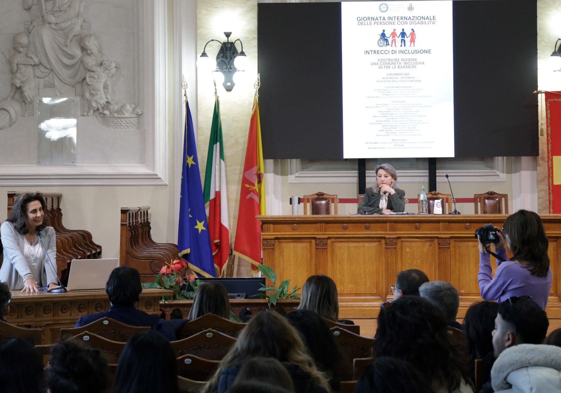 In occasione della Giornata internazionale delle persone con disabilità, l’Aula Magna del Rettorato ha ospitato un convegno intitolato “Intrecci di inclusione. Costruire insieme una comunità inclusiva oltre le barriere”. L’incontro – organizzato per la prima volta in compartecipazione dall’Ateneo e dal Comune di Messina – ha rappresentato una preziosa occasione di confronto fra coloro i quali, a vario titolo, sono impegnati sinergicamente nell’implementazione di una rete territoriale in favore dell’inclusività delle persone con disabilità.