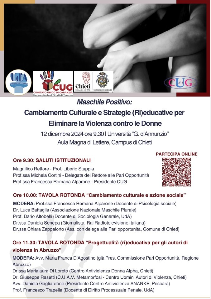 Il 12 dicembre 2024, alle ore 9:30, presso l’Aula Magna di Lettere del Campus di Chieti, si terrà l’evento intitolato “Maschile Positivo: Cambiamento Culturale e Strategie (Ri)educative per Eliminare la Violenza contro le Donne”, organizzato dal Comitato Unico di Garanzia (CUG) dell’Università “G. d’Annunzio”, con il patrocinio del Comune di Chieti e del CUG dell’Università di Teramo.
