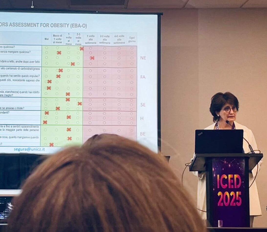 La prof.ssa Cristina Segura Garcia, responsabile dell’Ambulatorio di Ricerca Clinica e Terapia dei Disturbi Alimentari dell’U.O.C. di Psichiatria, insieme alla Dott.ssa Elvira Anna Carbone, giovane ricercatrice, hanno preso parte all’International Conference on Eating Disorders (ICED 2025), presentando i più recenti risultati dell’equipe UMG sul trattamento e la prevenzione dei disturbi alimentari attraverso contributi scientifici originali (presentazioni orali: “Clinical assessment of altered eating behaviors in people with obesity”; “The role of GLP-1 receptor agonists in the treatment of eating disorders”; “Genetic contribution to food addiction: the role of melanocortin system” e “INTERconNEcT-EDs: design and usability of a tailored guided self-help mobile app for EDs”).